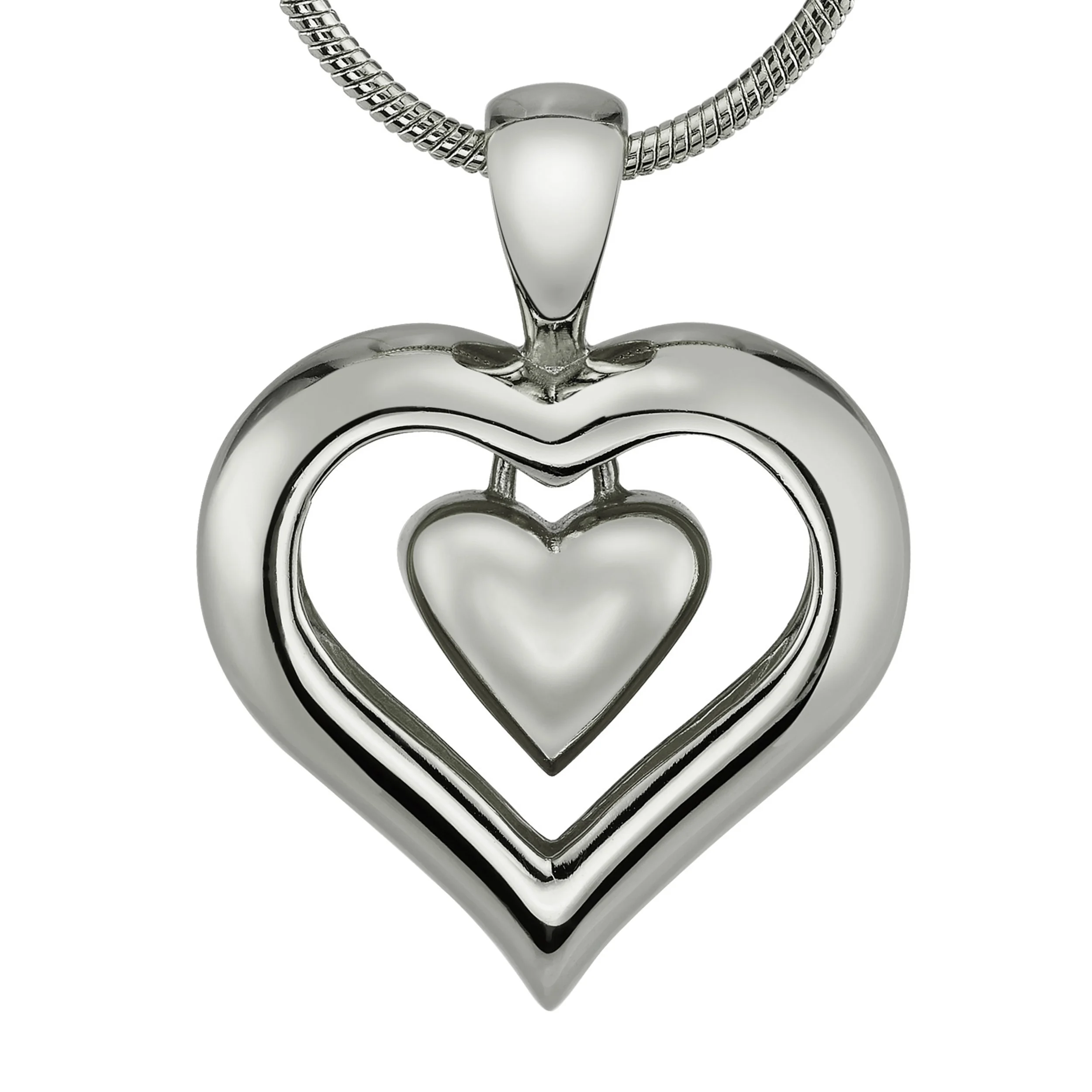 An elegant heart-shaped cremation necklace finished in bright, durable rhodium for a timeless silver look, designed to hold a small portion of ashes in a secure inner chamber. Discreet, meaningful, and made for everyday wear, it offers a gentle way to carry your loved one with you always.