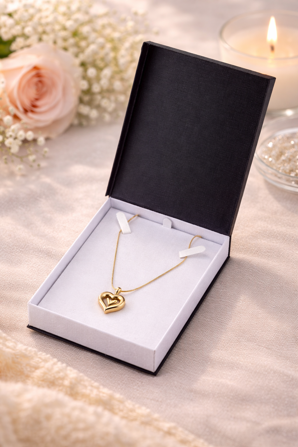 The full pendant — including both the outer and inner hearts — is about the size of a quarter. It’s noticeable enough to feel meaningful, while still being comfortable for everyday wear.